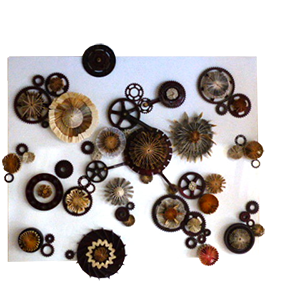 D’autres sont faites en carton comme “L’empreinte de l’homme sur le monde” réalisée pour la Cop 22, ou “Les engrenages” crées avec des matières associées comme le métal et le papier.
